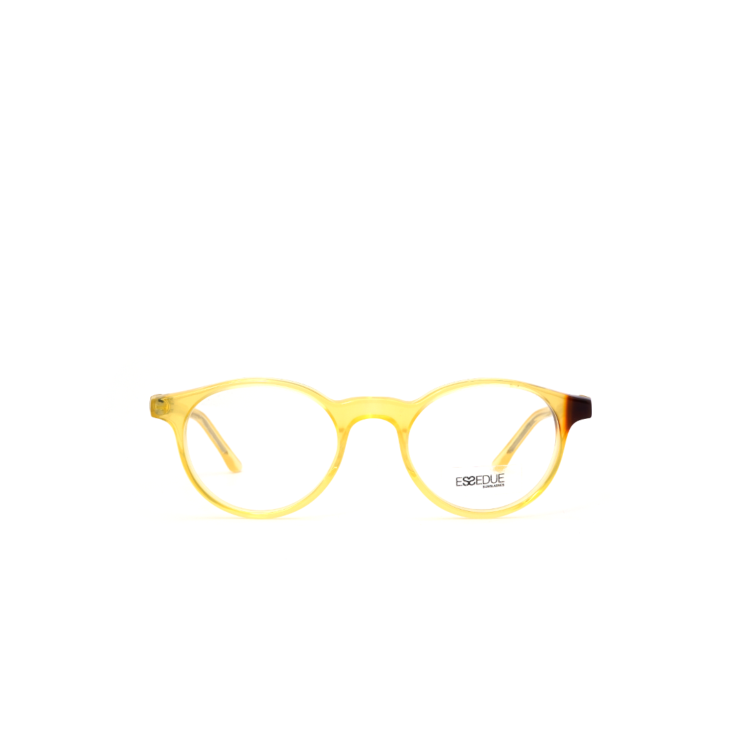 Armazón con lente circular color amarillo con detalle café, hecho a mano en Italia.