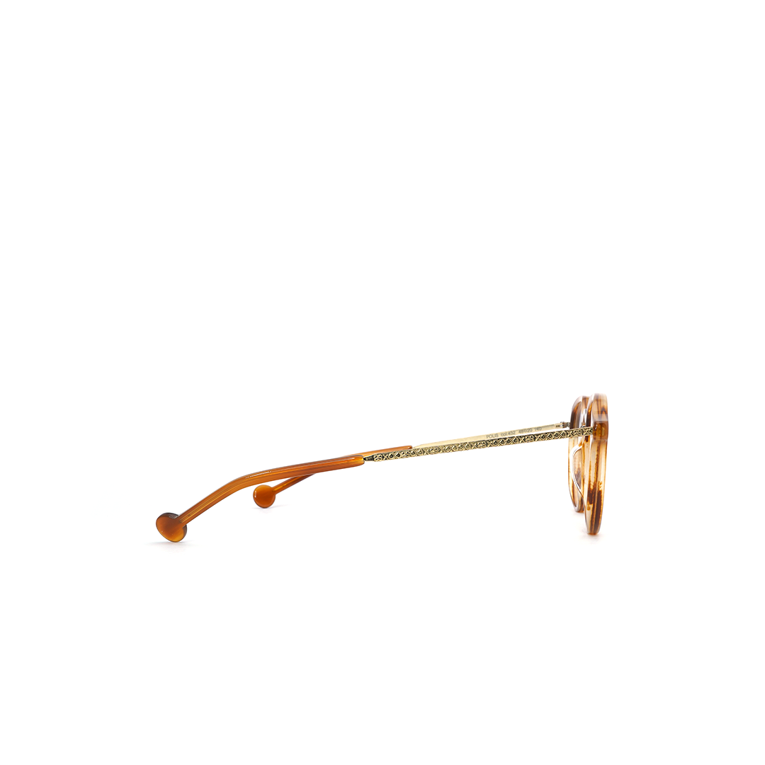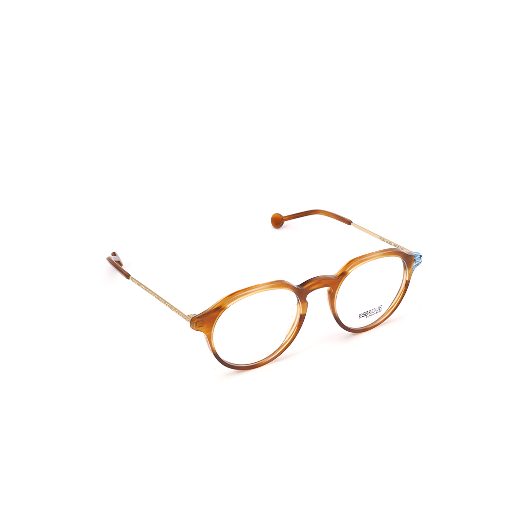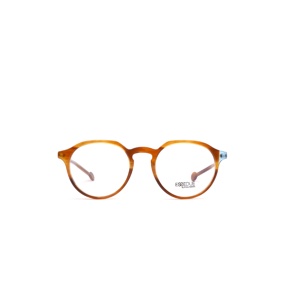 Armazón con lente circular en tonos marrón con detalle azul transparente, hecho a mano en Italia.