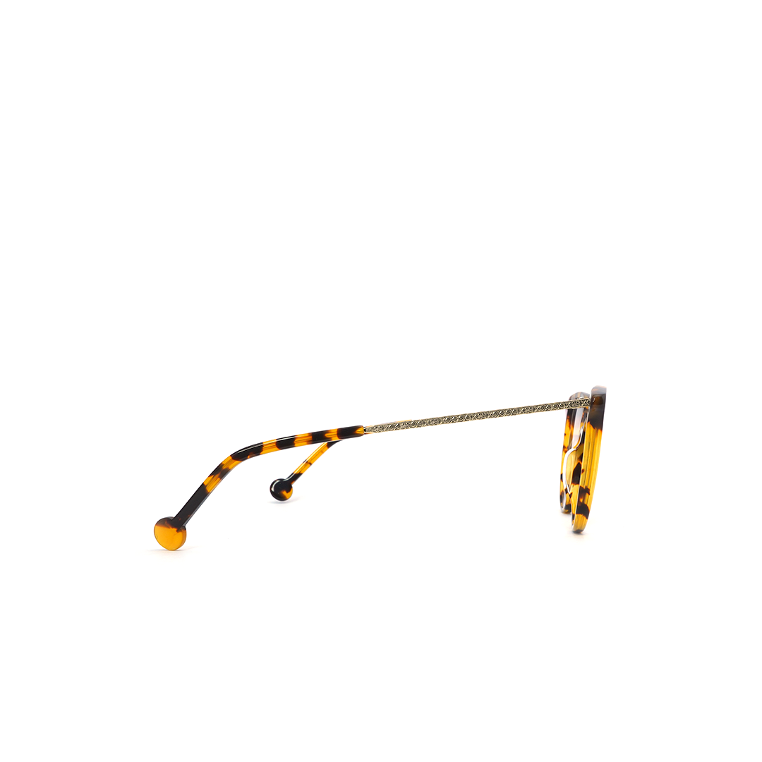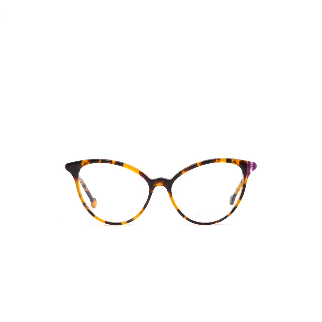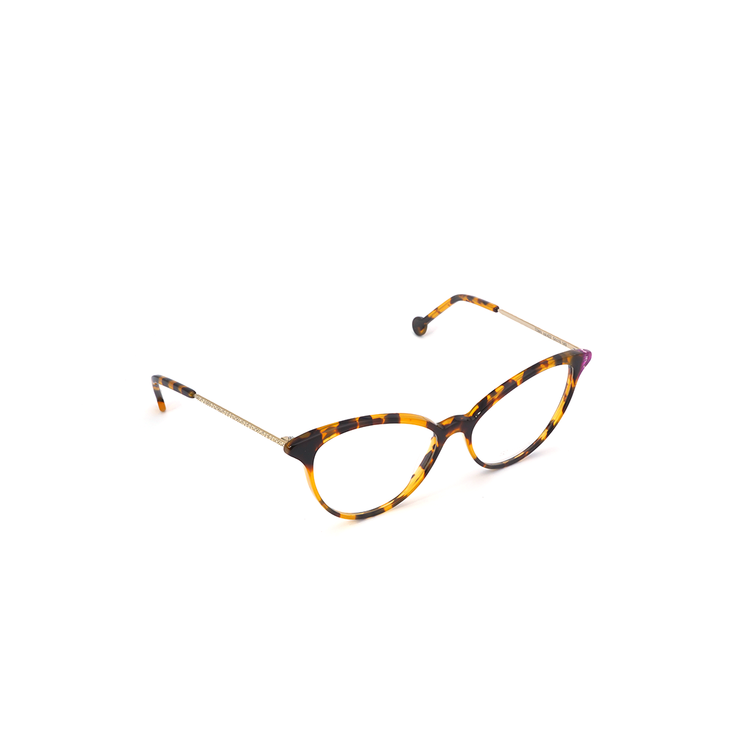 Armazón tipo “cat eye” en color tortoise-amarillo y detalle púrpura, hecho a mano en Italia.
