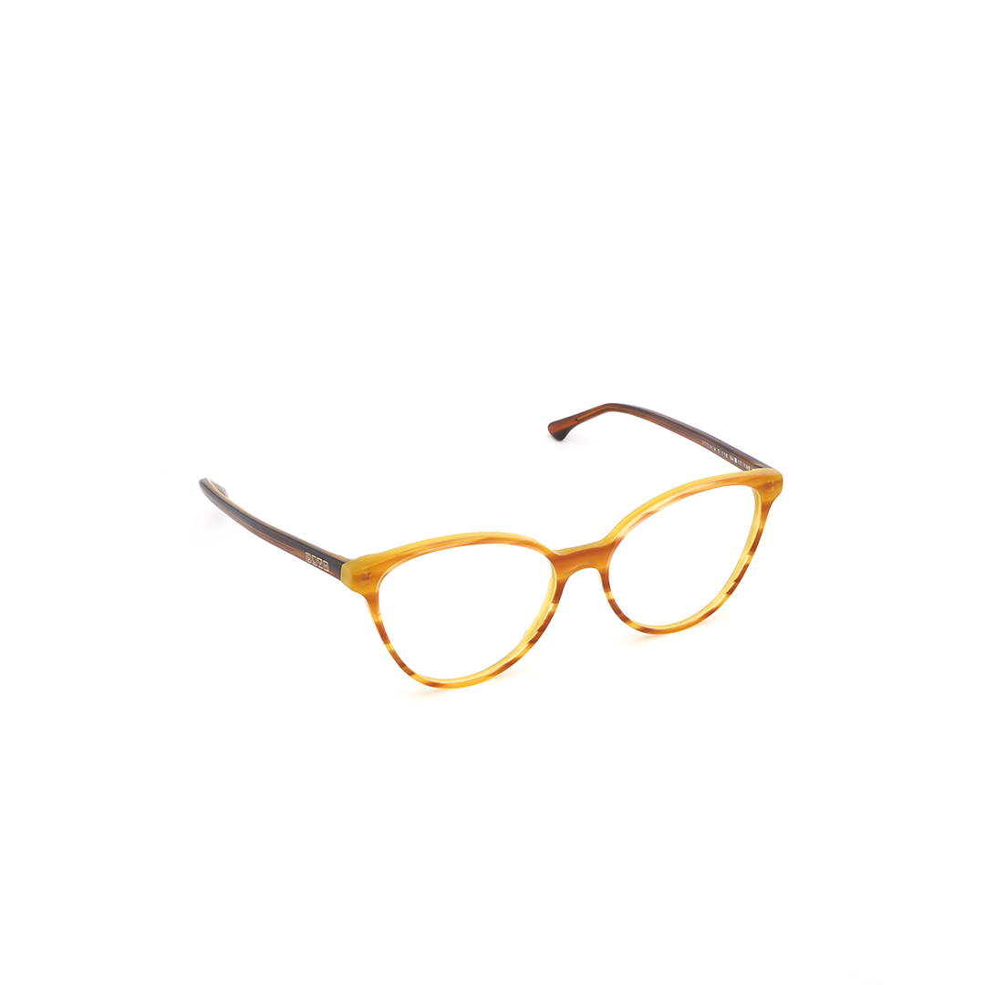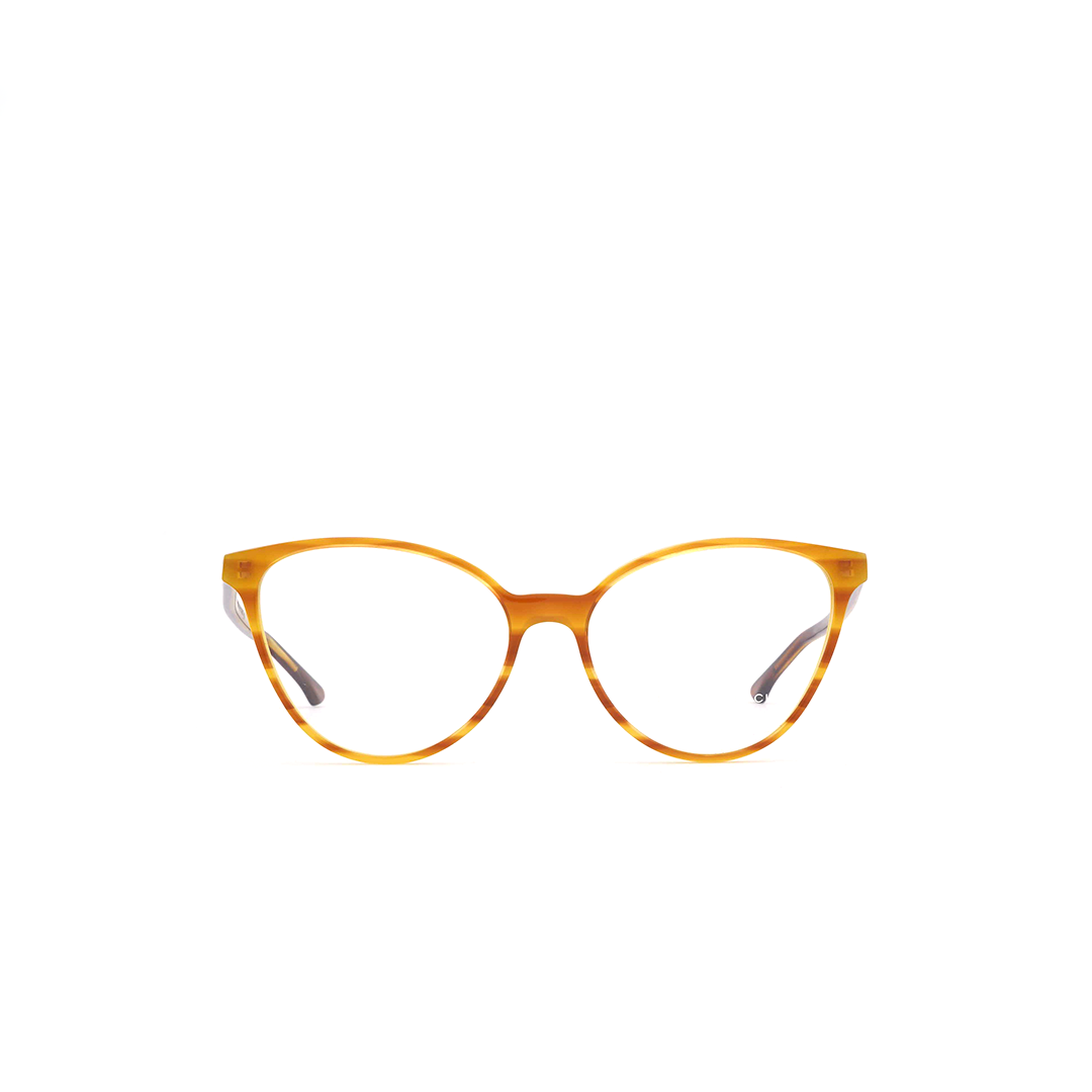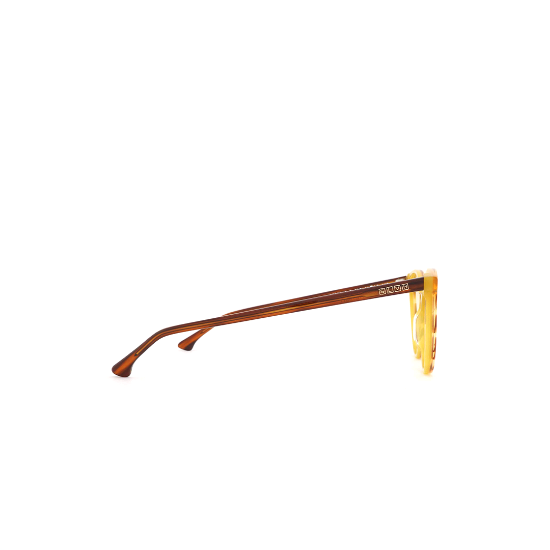 Armazón en tonos naranja, amarillo y café, hecho a mano en Italia.