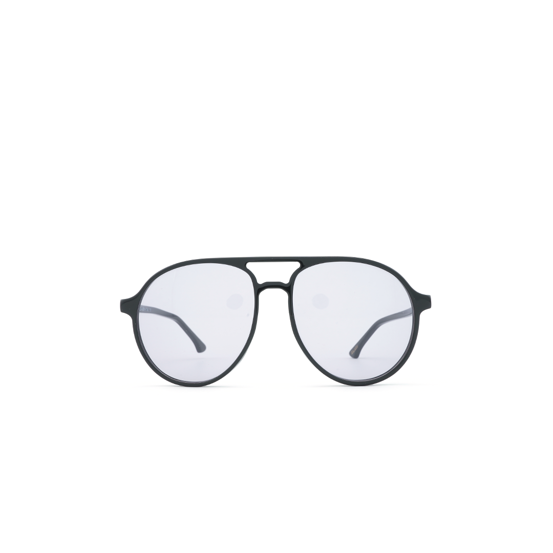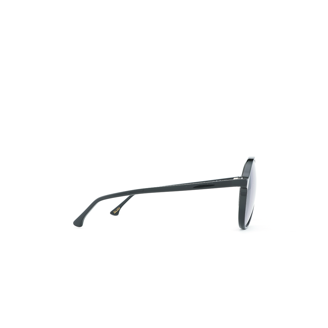 Lentes de sol tipo aviador en color negro, ancho frente de 140 mm y largo de pata de 145 mm, hecho a mano en Italia.