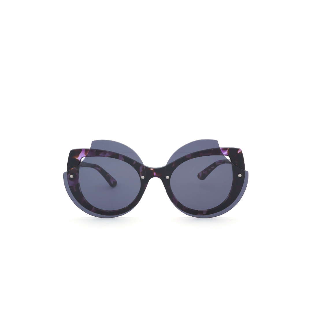 Lentes de sol en color tortoise-purpura, con lente negro circular , hecho a mano en Italia.