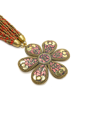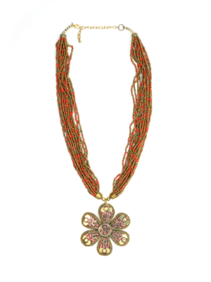 $369.00Collar de hierro con pedrería en color rojo y dorado, con dije en forma floral con pedrería.