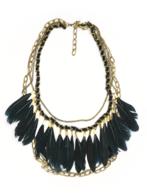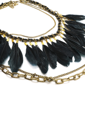 $599.00Collar de hierro con cadenas doradas, listón sintético y dijes de pluma en color negro.
