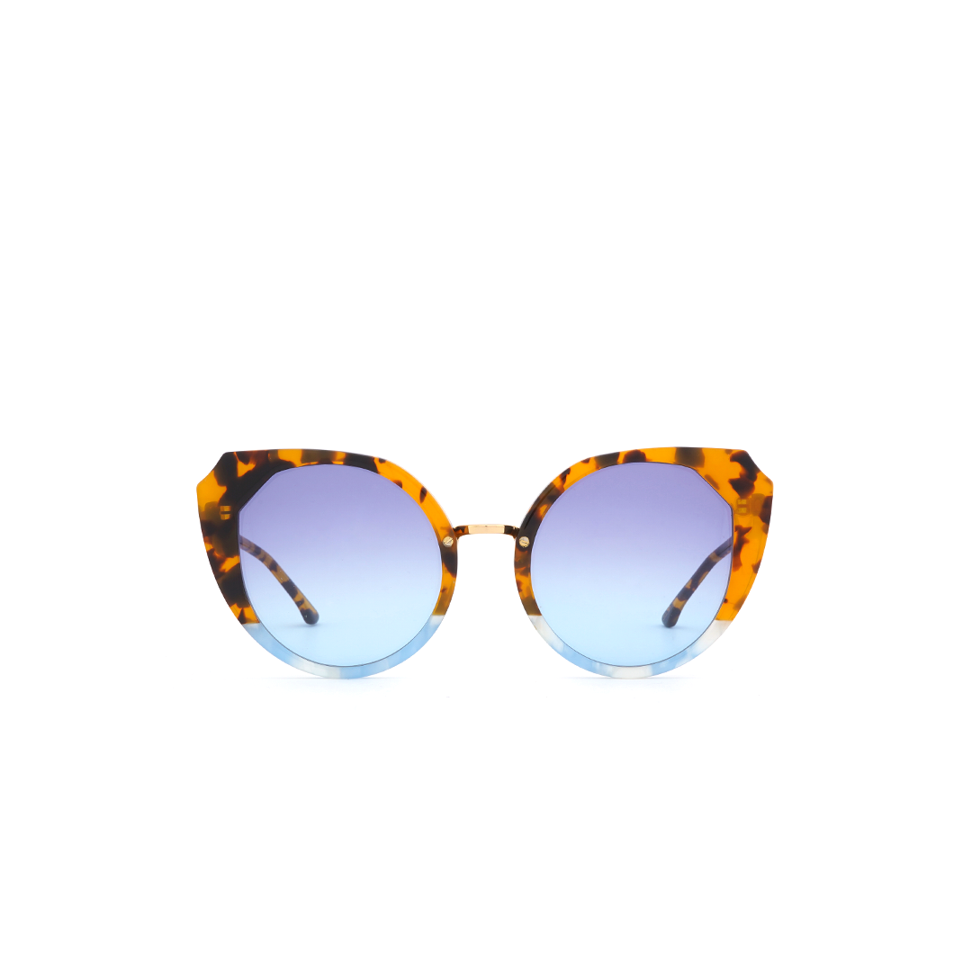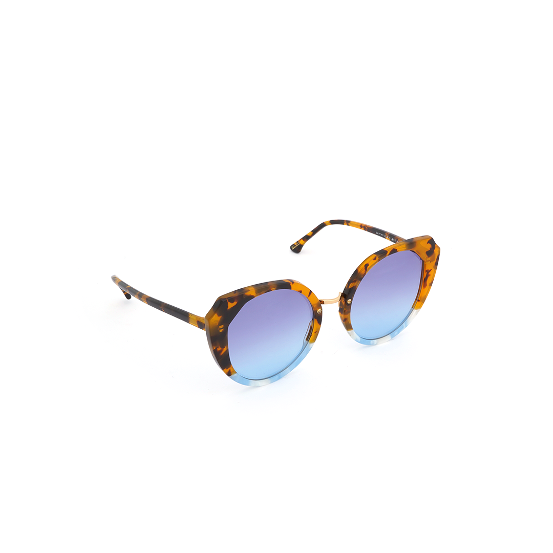 Lentes de sol tipo “cat eye” en color tortoise-amarillo y lente azul, hecho a mano en Italia.