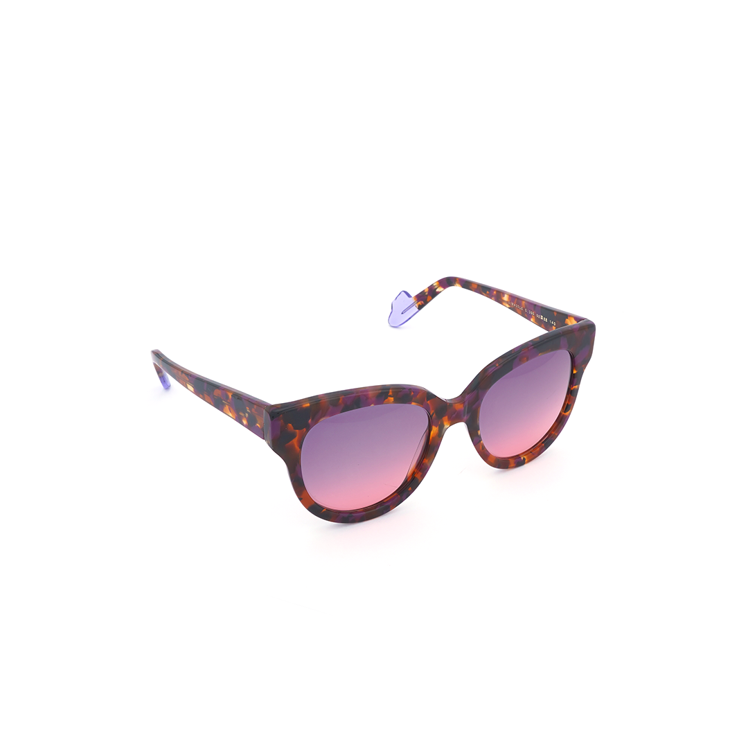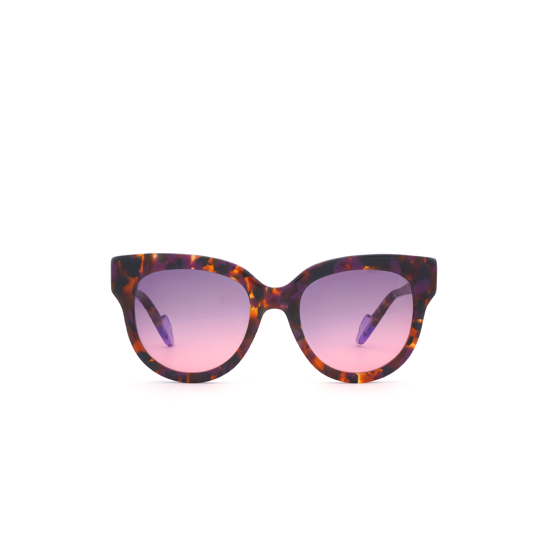 Lentes de sol en color tortoise-purpura, negro y café, con lente rosa, hecho a mano en Italia.